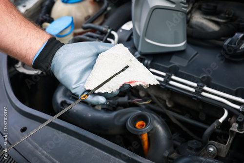Worker checking motor oil level in car with dipstick, closeup