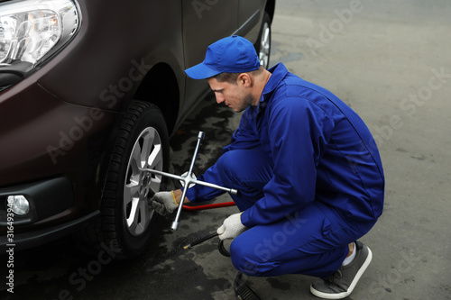 men at work, drive, air, modern, professional, business, inspection, industry, maintenance, repair, fix, garage, workshop, mechanic, shop, check, change, vehicle, automotive, automobile, auto, meter, pressure, checking, braces, cross, wrench, spanner, car, technology, wheel, tyre, tool, equipment, instrument, uniform, portrait, caucasian, diagnostic, man, male, person, adult, outdoors, station, background, tire, service