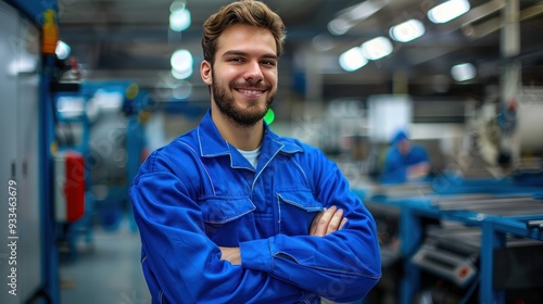Worker in blue workwear, arms crossed, smiling, production line background, photorealism, detailed.