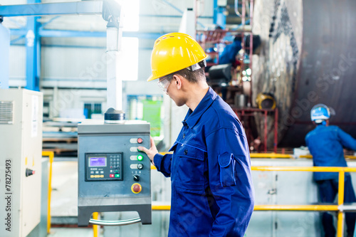 Worker in factory at machine control panel