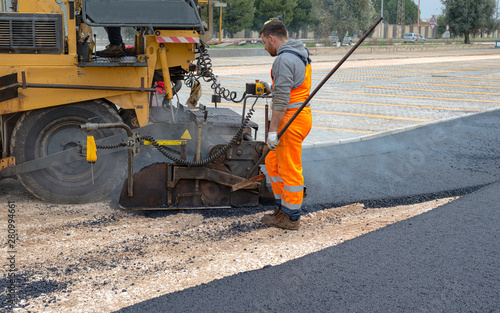 Worker regulate tracked paver laying asphalt heated to temperatures above 160 ° pavement on a runway