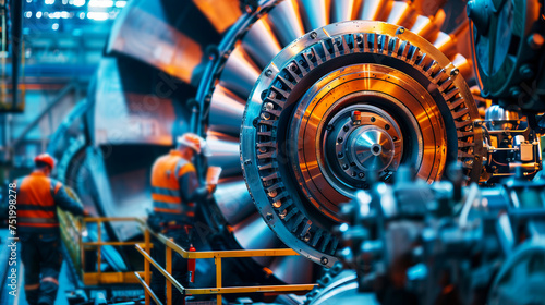 Workers in reflective vests and helmets operate complex machinery within an industrial turbine facility.