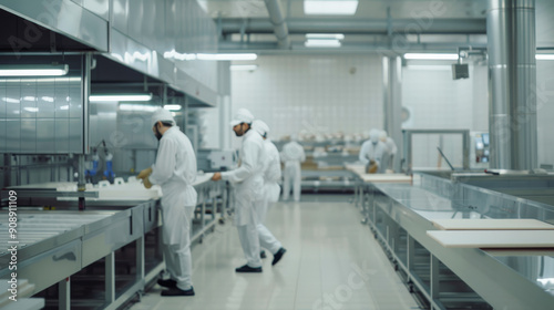 Workers in white uniforms and hairnets move efficiently in a bright, sterile industrial kitchen, focused on various tasks.
