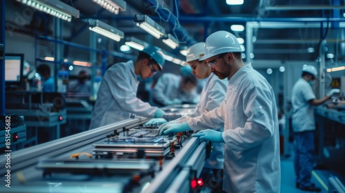 Workers on an assembly line in a hightech factory producing electronics and appliances. Concept Assembly Line Efficiency, High - Tech Manufacturing, Factory Workers, Electronics Production