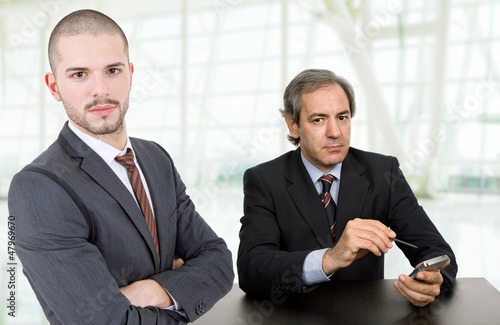 men at work, working, business, businessman, team, teamwork, thinks, thought, attaching, 2, white, caucasian, corporate, desk, executive, photogenic, happy, isolated, male, mature, man, modern, office, palmtop, pen, adult, background, boss, people, person, phone, portrait, sitting, smile, studio, success, suit, table, work, young
