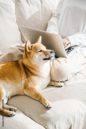 animal, home, business, canino, chinese, comfort, computer, cute, dawn, dog, electronic, eyeglass, family, freelancer, furniture, home, indoor, indoor, laptop, lazy, living room, love, male, man, online, pet, quiet, relaxation, room, shiba inu, shiba inu, to sit, sofa, technology, woman, working