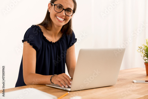 woman, laptop, working, office, cyberspace, business, education, technology, entrepreneur, home, eyeglass, teacher, student, work, communication, to sit, computer, write, smile, beautiful, girl, sitting, serene, cool, young, female, studio, caucasian, person, people, pretty, style, lifestyle, casual attire, smiling, latin, american, hispanic