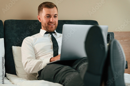 Working by lying down on the bed with laptop. Businessman is indoors in the hotel room