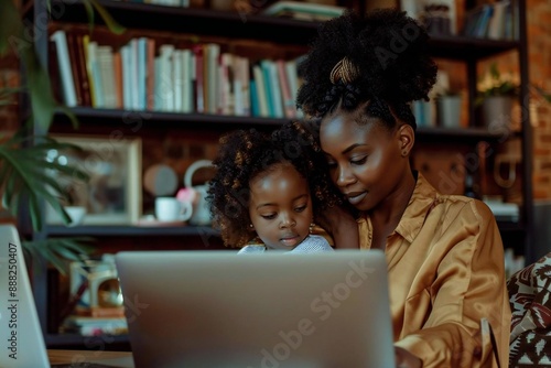 Working from Home: Strong Mother-Daughter Bonding with Beautiful Young African American Woman