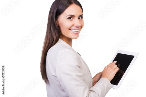 woman, young adult, caucasian, beautiful, attractive, female, well-dressed, elegance, business, isolated on white, background, white, studio shot, manager, job, businesswoman, businessperson, working, computer, wireless technology, cyberspace, typing, technology, new, lifestyle, smiling, toothy smile, candid, happiness, confidence, expertise, professional occupation, long hair, success, backview