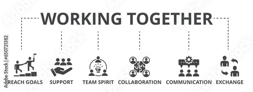 Working together web banner icon vector illustration concept for team management with collaboration, reach goals, team spirit, support, communication, and exchange icon