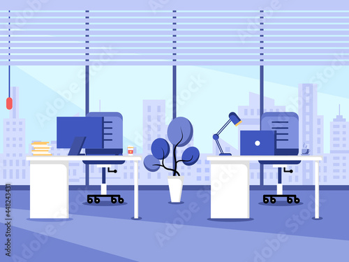 workplace, workstation, office, desk, workspace, interior, home, comfort, social, study, college, nobody, working, technology, monitor, corporate, background, communication, company, co-worker, equipment, freelance, ceo, environment, building, empty, indoor, space, cartoon, desktop, place, window, modern, illustration, furniture, work, job, concept, computer, flat, table, chair, room, design, vector, business
