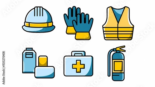 Workplace Safety Gear Hard Hat, Gloves, Safety Vest, First Aid Kit, and Fire Extinguisher Icons