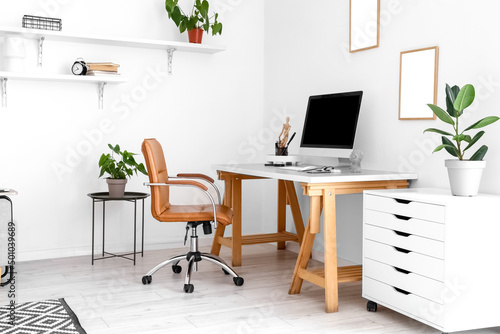 computer, modern, wall, white, workplace, alarm, background, book, business, chair, chest, clock, colours, comfortable, contemporary, decor, design, device, drawer, fashion, flat, floor, furniture, contraption, home, house, houseplant, indoor, interior, cyberspace, job, keyboard, light, monitor, mouse, nobody, object, office, online, room, shelf, style, stylish, table, technology, trend, work