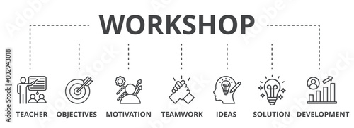 Workshop concept icon illustration contain teacher, objectives, motivation, teamwork, ideas, solution and development.