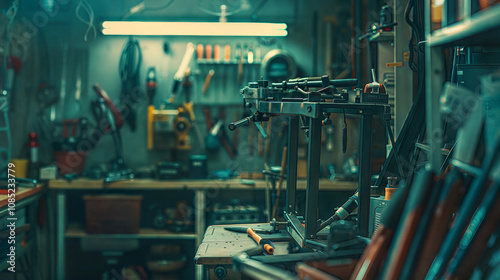 workshop with tools and equipment in a craftsman’s garage. Bicycle Repair Workshop