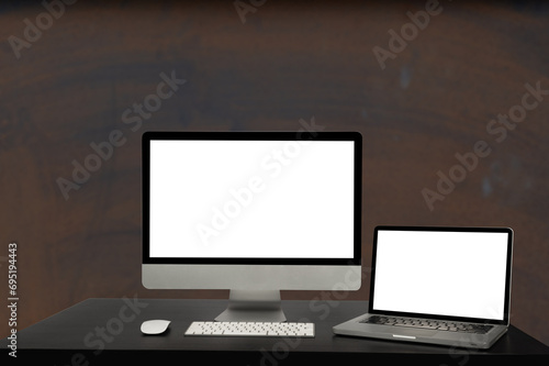Workspace with computer, keyboard, coffee cup and Mouse with Blank or White Screen Isolated is on the work table.