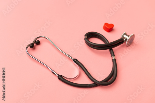 World health day concept. Stethoscope and red heart on pink background. Global health care