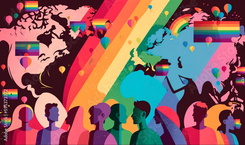 World map with vibrant rainbow colors and flags that represent diversity and acceptance of LGBT community across different cultures and nations, promoting unity among all human beings. Generative AI.