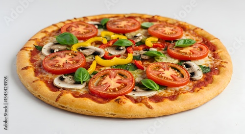World Pizza Day – Delicious vegan pizza topped with fresh vegetables, tomatoes, peppers, mushrooms, rocket and onions, celebrating the taste, diversity and global love of pizza