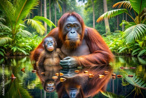 rainforest, orang, mother, baby, primate, borneo, sumatra, jungle, canopy, endangered, conservation, protection, wildlife, nature, biodiversity, habitat, tree, water, nurturing, parenting, mammal, tropical, green, ecosystem, vulnerable, species, sanctuary, preservation, deforestation, awareness, campaign, love, family, primate, survival, river, mirror, leaf, vine