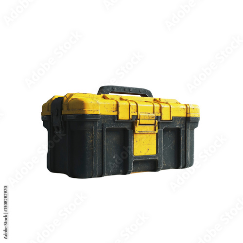 Worn Yellow and Black Plastic Tool Box on Transparent Background