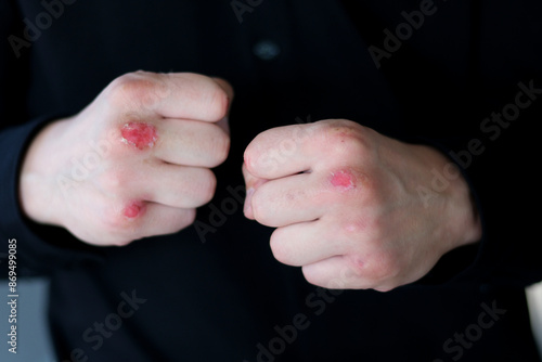 Wounds on fists. Medical glue. Athlete boxer covering wounds on hand after fight. Boxer beaten fists