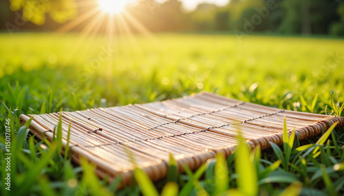 Woven bamboo mat with warm vibe on grassy field during sunset with sunlight rays