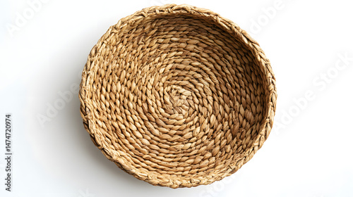 Woven Basket's Texture and Design: An overhead, close-up shot of a meticulously crafted woven basket, emphasizing its natural texture, spiral pattern and earthy tones.