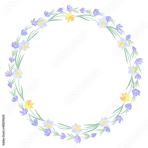 frame, crocus, daffodil, flower, border, chaplet, design, copy space, purple, yellow, white, narcissus, decoration, illustration, card, decorative, floral, flower, vector, holiday, spring, easter, art, pastel, colours, leaf, celebration, colourful, summer, green, romantic, on white, isolated, blossom, greeting, garden, background, plant, wedding, invitation, round, circle, botanical
