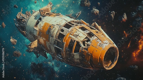 space, spaceship, wreckage, debris, asteroid, nebula, cosmos, universe, galaxy, star, dust, damage, destruction, crash, accident, exploration, adventure, science, fiction, fantasy, futuristic, technology, travel, journey, flight, orbit, planet, moon, rocket, satellite, craft, vehicle, metal, rust, old, broken, abandoned, dark, colourful, scene, background, image, illustration, three-dimensional, render
