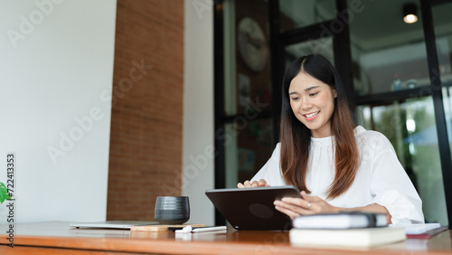Writer woman reading information on tablet and thinking creative idea for business content in cafe..