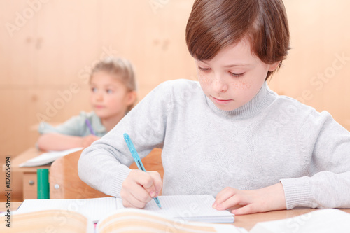 young, school, children, grade, classroom, class, study, pupil, hand, learner, junior, schoolchild, boy, to sit, selective, sharpened, write, people, caucasian, lesson, learn, little, subject, small, elementary, half, length, copy, book, indoor, childhood, schoolwork, classmate, desk, marker, children, paper, high, point, homework, note, mark, lifestyle, cute, condensed, joy, alone