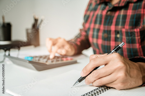 Writing paper on desk, businessman hand using calculator Calculating bonus(Or other compensation) to employees to increase productivity.