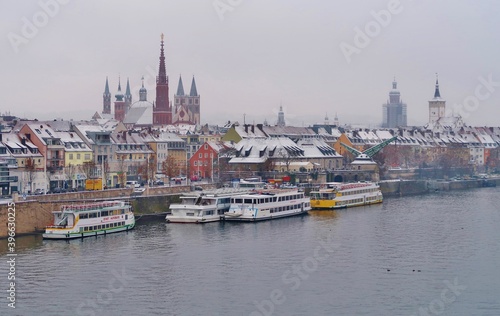 würzburg, winter, snowy, christmassy, snow, heaven, covered, fog, grey, historic, church tower, cupola, cupola, building, house, silhouette, flux, river bank, water, ship, architecture, panorama, city landscape, franc, german, europa, tour tourism