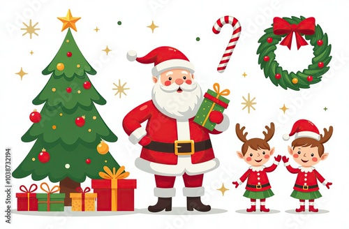 Xmas items set. Christmas tree, Santa with gifts, elves. Festive wreath, candy canes, gingerbreads. New year decorations. Winter holiday decor. Flat isolated vector illustration on white background