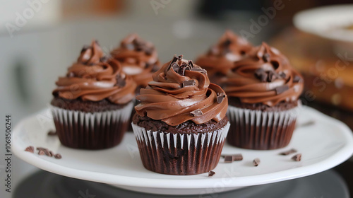 🧁 Decadent chocolate cupcakes topped with rich, creamy chocolate frosting and shavings of dark chocolate.