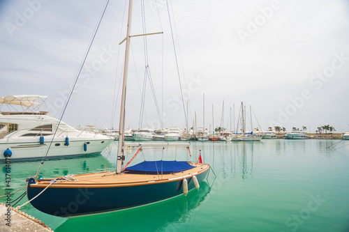 Yacht parking in harbor. White sailing yachts at the pier. Sea yacht club. Aegean sea. Athens, Greece. Blue sky.