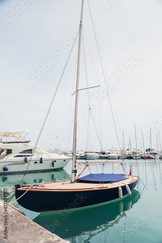 Yacht parking in harbor. White sailing yachts at the pier. Sea yacht club. Aegean sea. Athens, Greece. Blue sky.