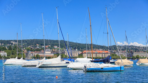 yacht, view, zurich, switzerland, europa, city, lake, city landscape, blue, sky, water, mast, buoy, hill, tree, green, summer, summer
