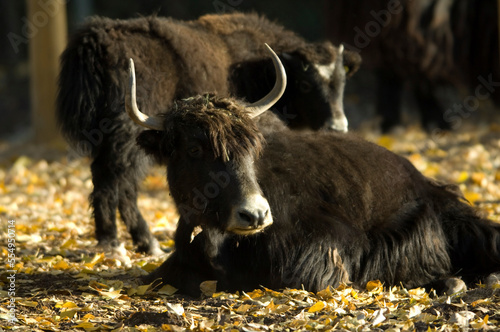 horn, resting, enclosure, fur, zoo, yak, zoo animal, horizontal, outdoors, day, closeup, sunny, yellow, warmth, bright, portrait, ground, standing, sunlit, us, mammal, basking, lying down, half face, looking away, north america, copy space, full-length, captivity, bovidae, animal, leaf, colorado, color image, blurred background, animal portrait, denver, no people, leaf litter