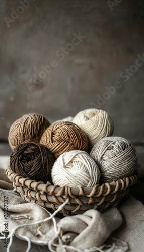 Yarn balls in shades of beige and brown on knitted texture background. Handcraft and cozy concept