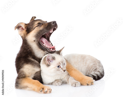 yawning mixed breed dog lying with small cat. isolated on white