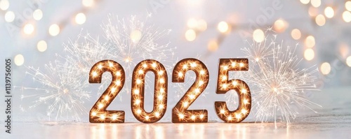 Year-end concept featuring New Year 2025 countdown. New Year celebration with illuminated 2025 and festive sparkles in the background