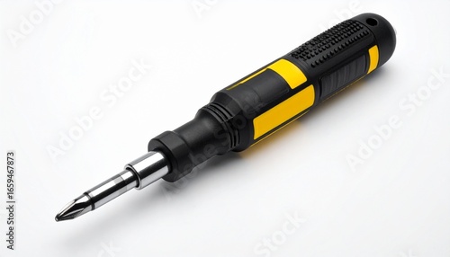 screwdriver, tool, yellow, black, grip, handle, textured, shaft, metal, steel, bit, phillips, hardware, bricolage, repair, household, mechanical, compact, portable, hard-wearing, ergonomic, utility, precision, twirling, torque, fastener, construction, maintenance, contraption, versatile, efficient, functional, sleek, modern, workshop, equipment, control, practical, essential