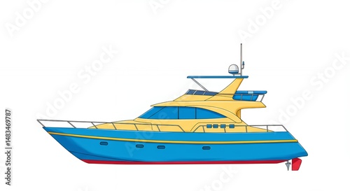yacht, boat, ship, motorboat, marin, yellow, blue, watercraft, illustration, graphic, design, transport, travel, holiday, leisure, isolated, sideview, profile, cartoon, flat, vector, drawing, nautical, deck, hull, copy space, luxury, sailing, cruise, ocean, sea, water, vacation