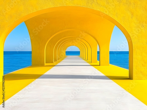 ocean view, architecture, pathway, summer, bright, vibrant, colours, abstract background, tunnel, perspective, design, geometry, modern, contemporary, minimal, simple, clean, line, shape, curve, bright yellow, blue water, horizon, sunny day, tranquil, serene, peaceful, calm, coastal, escape, journey, travel, vacation, holiday, relaxation, building design, abstract art, digital artwork, computer graphic, graphic design