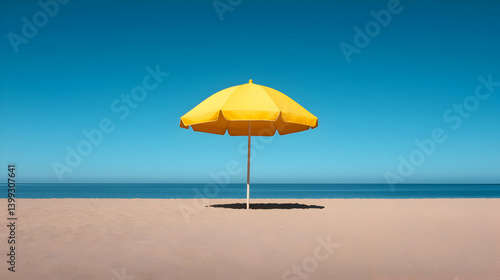 Yellow Beach Umbrella on Sandy Shore Under Bright Blue Sky