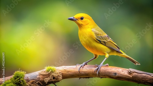 Yellow bird perched gracefully on a fallen branch, wildlife, nature, birdwatching, peaceful, tranquility, bright, colorful, feathers