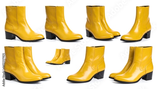 boot, yellow, leather, shoe, style, fashion, ankle, high, low, pair, collection, studio, product, display, isolated, elegant, trendy, modern, bright, shiny, closeup, multiple, variety, detail, accessory